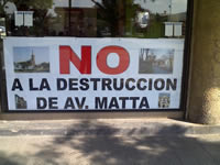 Carteles por doquier, que dicen “No a la destrucción de Avenida Matta” cubren las fachadas de locales comerciales y casas particulares de la importante arteria capitalina, vía alternativa en el eje oriente- poniente para la Alameda y que se encuentra en un lamentable estado de abandono, por la mala calidad de su calzada, que se encuentra totalmente desnivelada y con los viejos adoquines asomándose, como mudos testigos de los tiempos pasados.